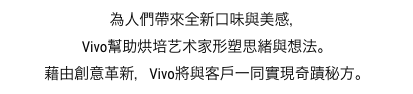 藉由我們獨特的乳化與發酵技術,Vivo提供風味濃厚的人造奶油、一系列具有極佳特點的鲜奶油、可營造純正風味的糕點材料,以及糕點及麵包製作不可或缺的其他產品。我們旨在成為顧客的最佳夥伴,藉由一同努力並提供美味秘方,成就「創意革新」。